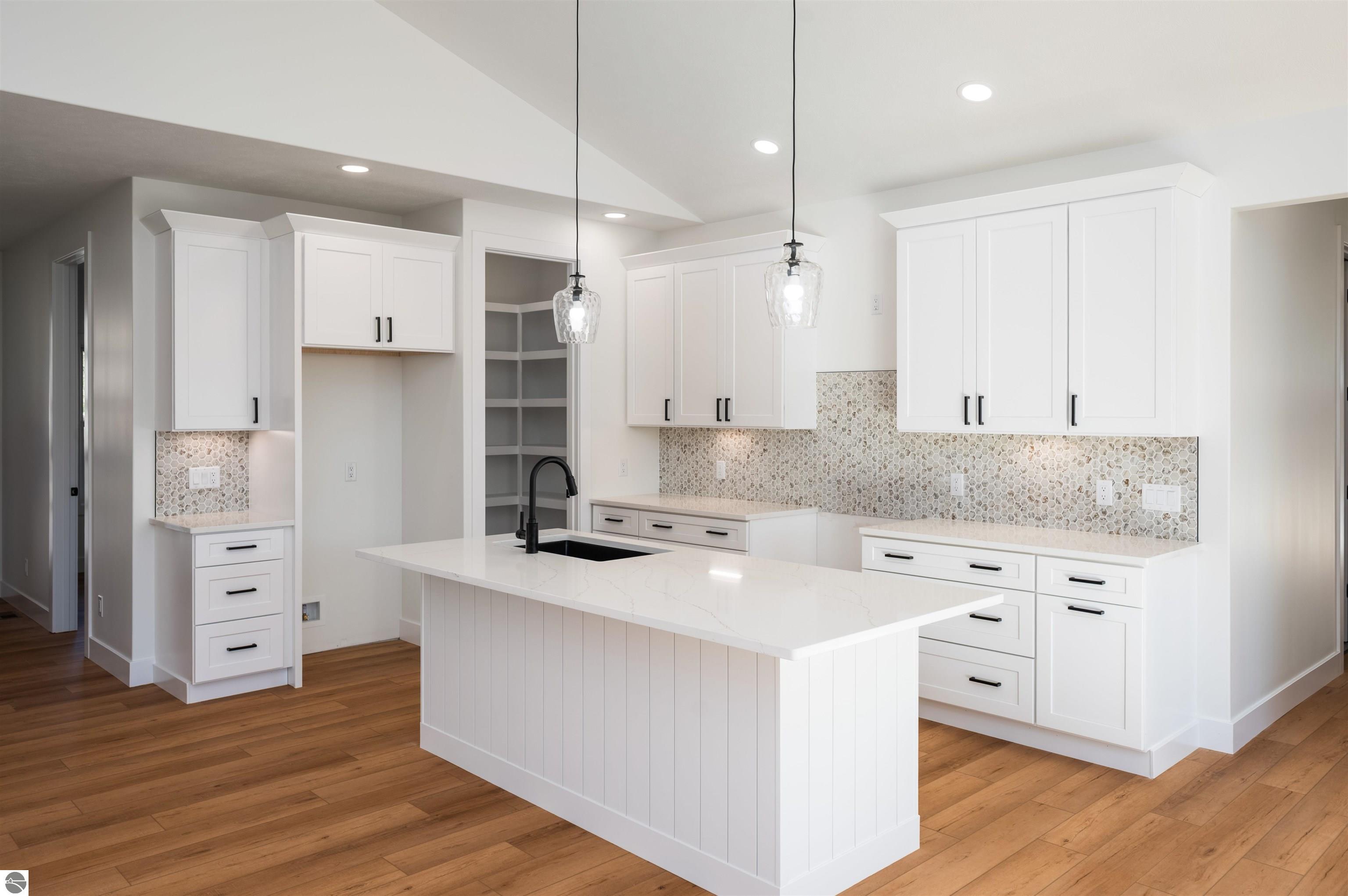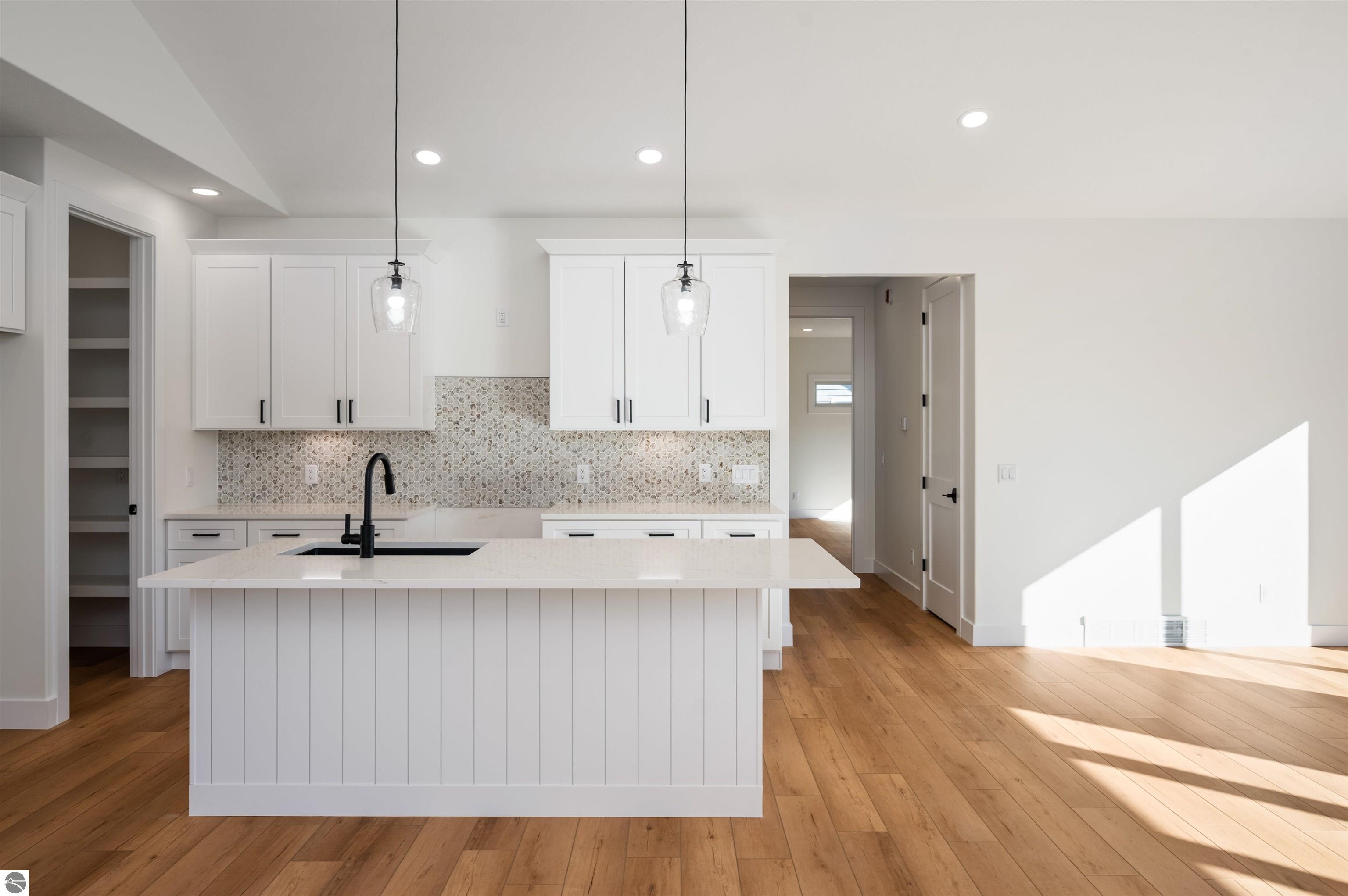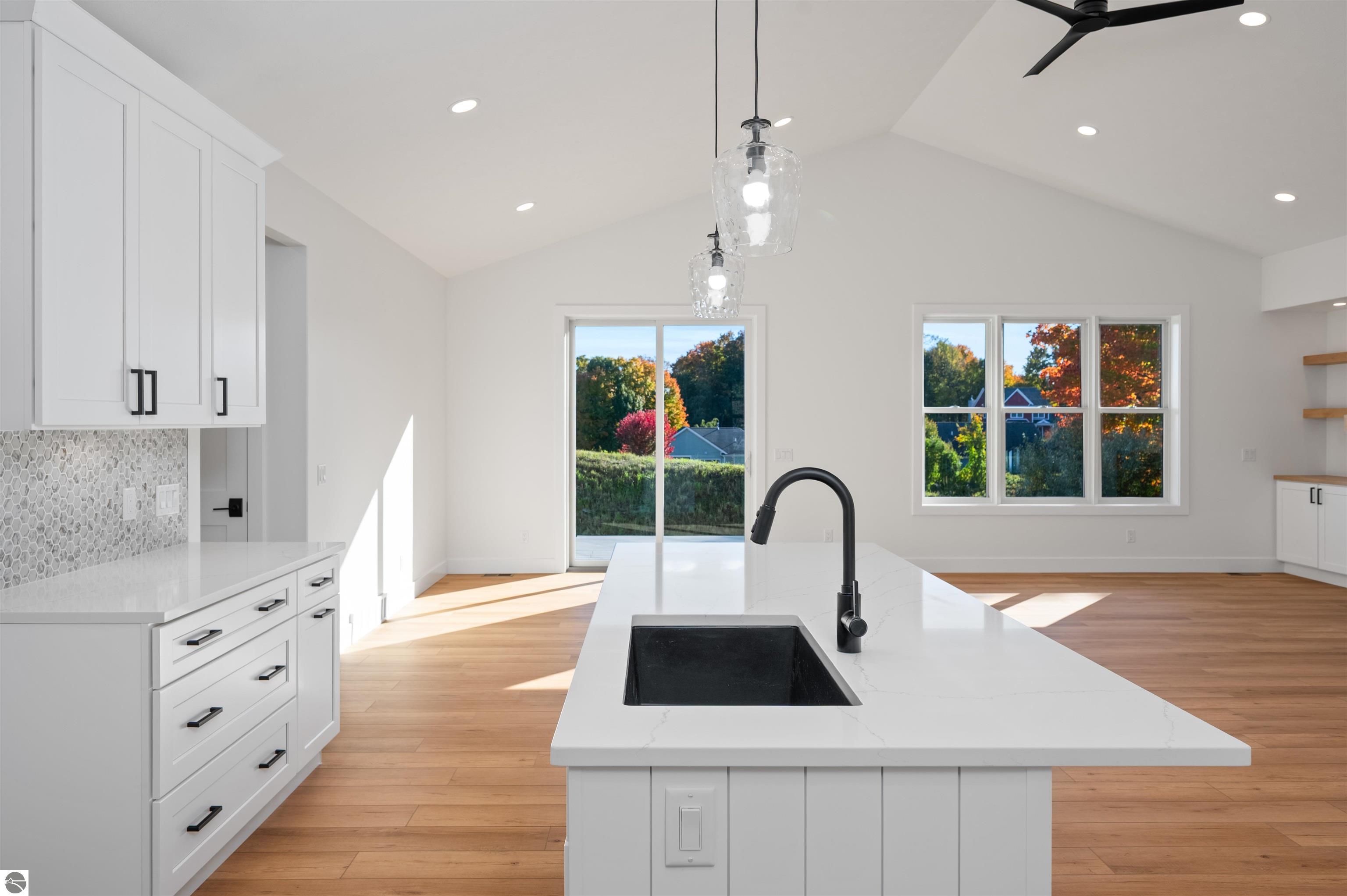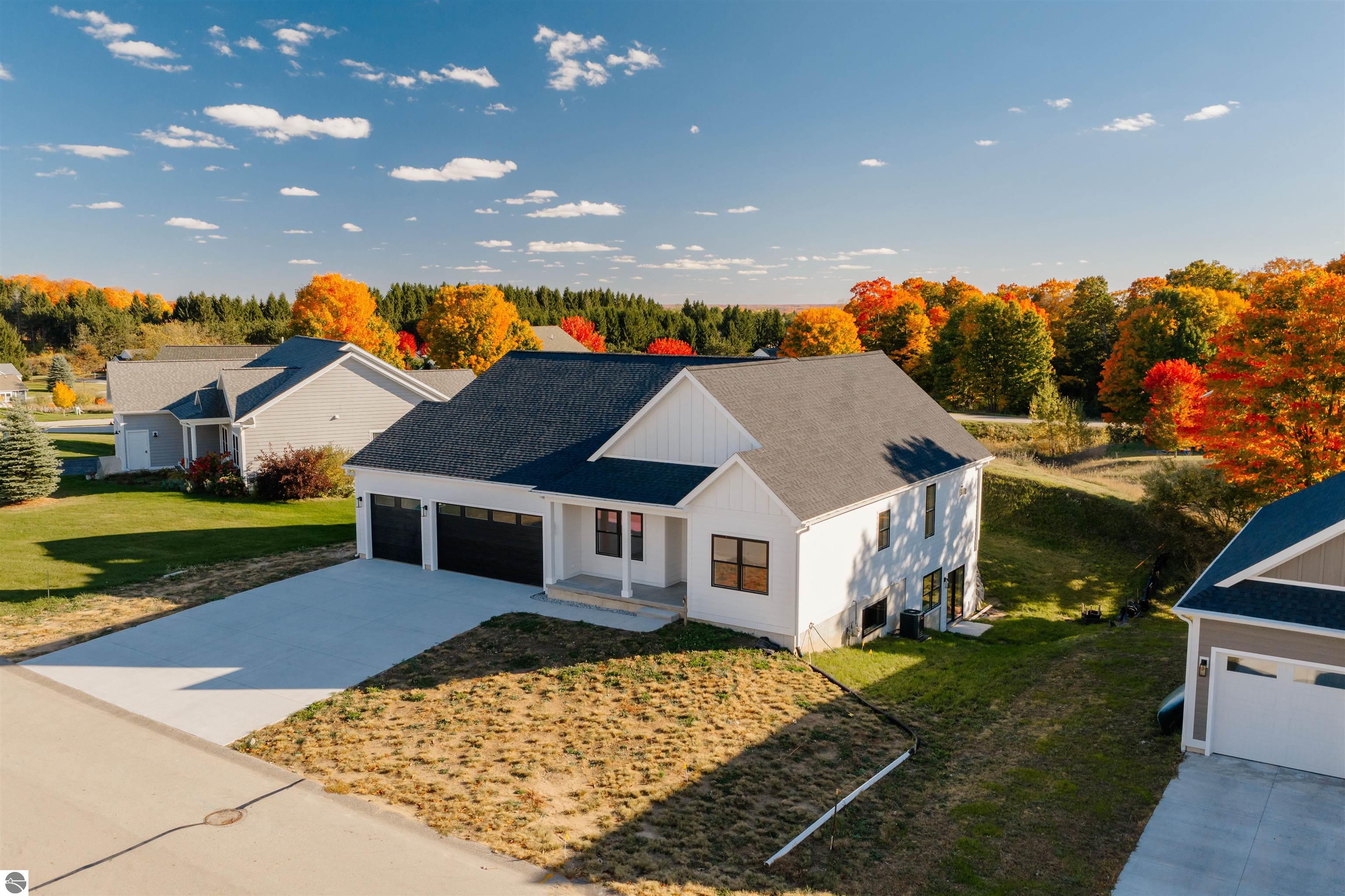 Introducing a brand new modern luxury home on the vibrant west side of Traverse City! The builder just completed this stunning 5-bedroom, 3-bathroom home, complete with a finished 3-car garage. Meticulous attention has been paid to every detail, and the curb appeal is impressive. The home features quartz counters, luxury vinyl plank floors, a shiplap fireplace and island, built-in bookcases, 8-foot doors, LP Smartside trim and siding, central air, a covered concrete front porch, and a maintenance-free composite wood deck. The main floor includes a primary ensuite with tiled floors and a tiled floor-to-ceiling shower, as well as two additional bedrooms and bath. The finished walkout lower level showcases two additional bedrooms, a spacious family room, and a full bath. Municipal water and sewer. Residents can enjoy the walking trails within the Lone Tree community, which even connect to TC West High School. You'll love this close-to-everything location that's just a few miles from downtown!