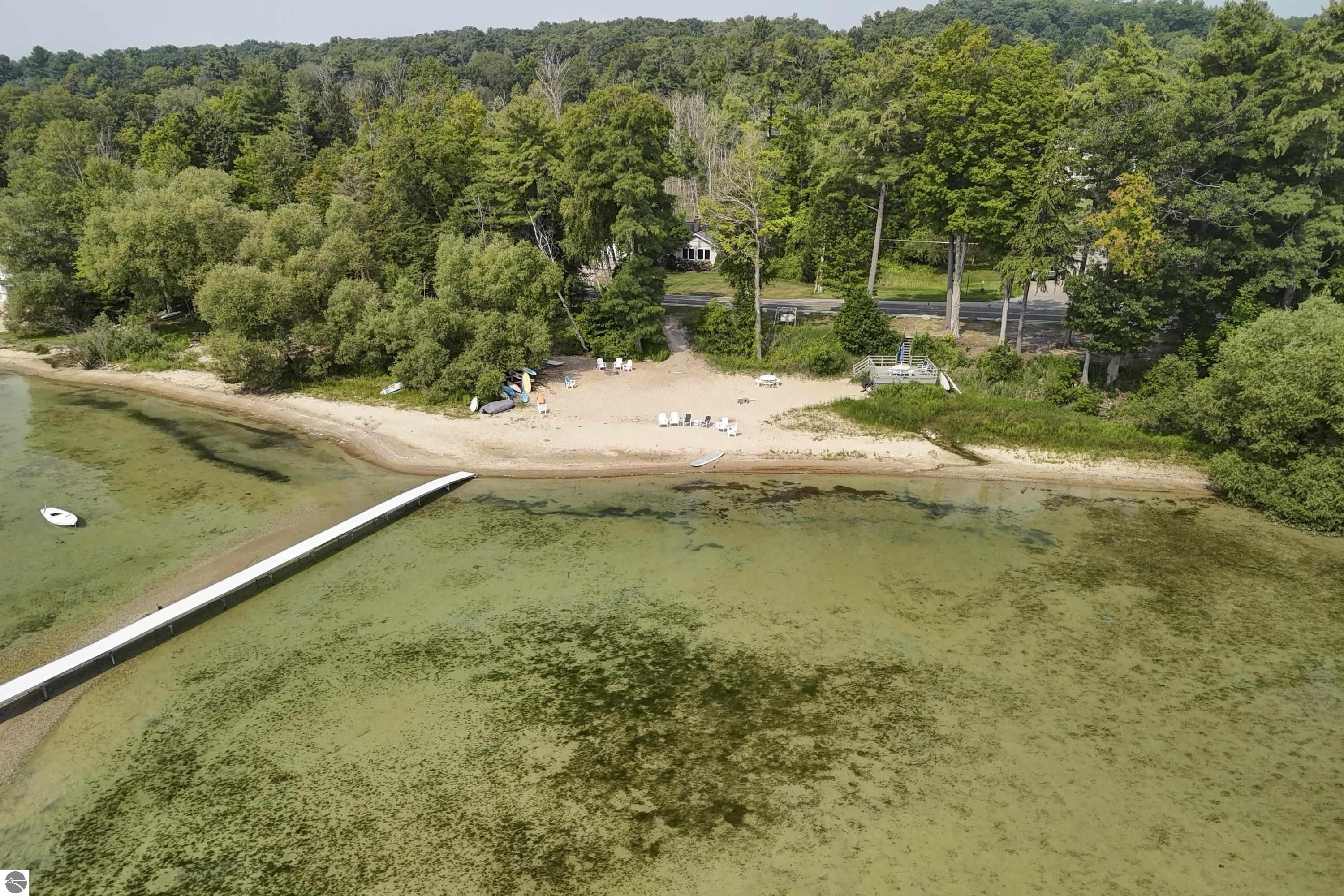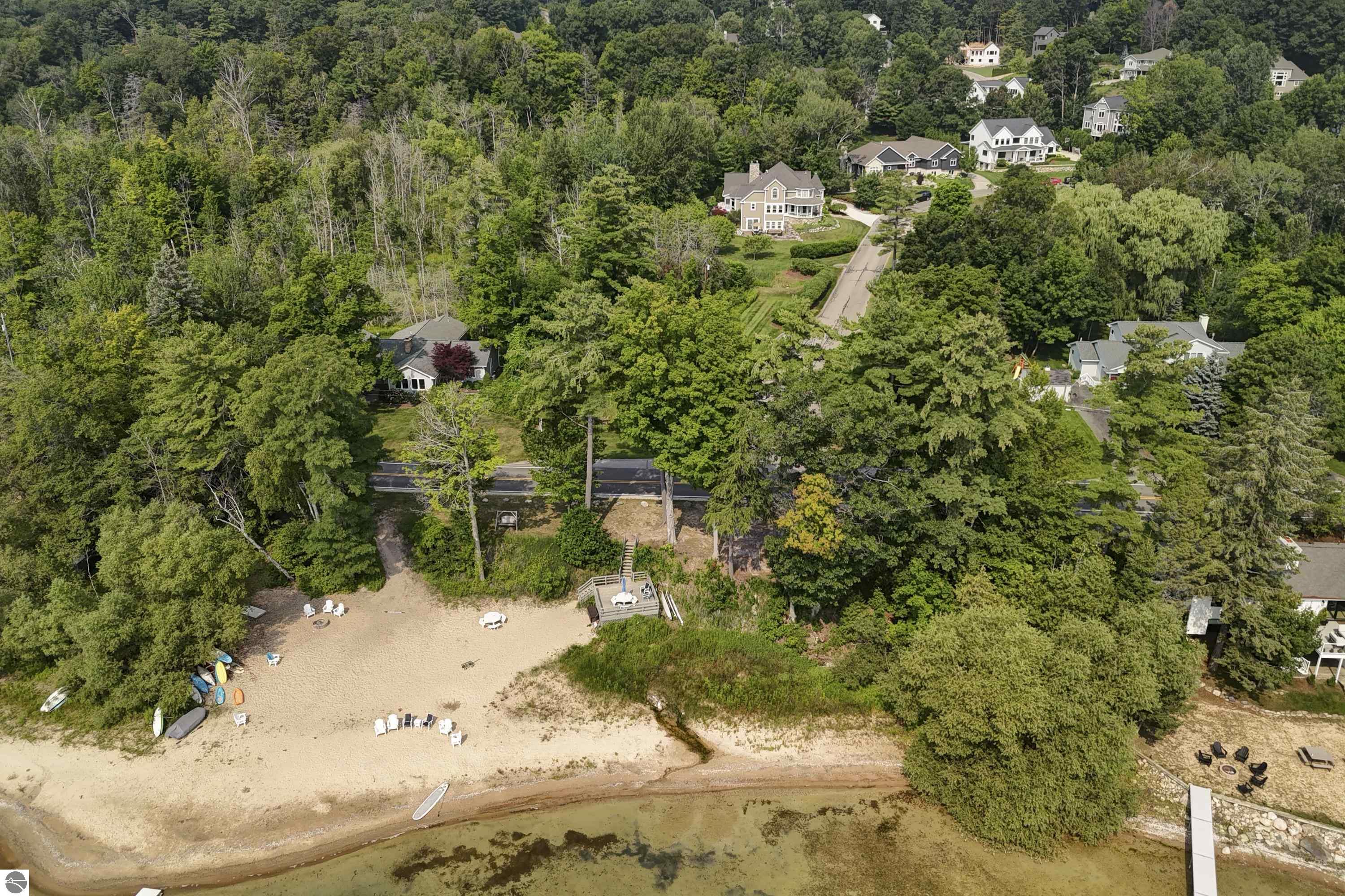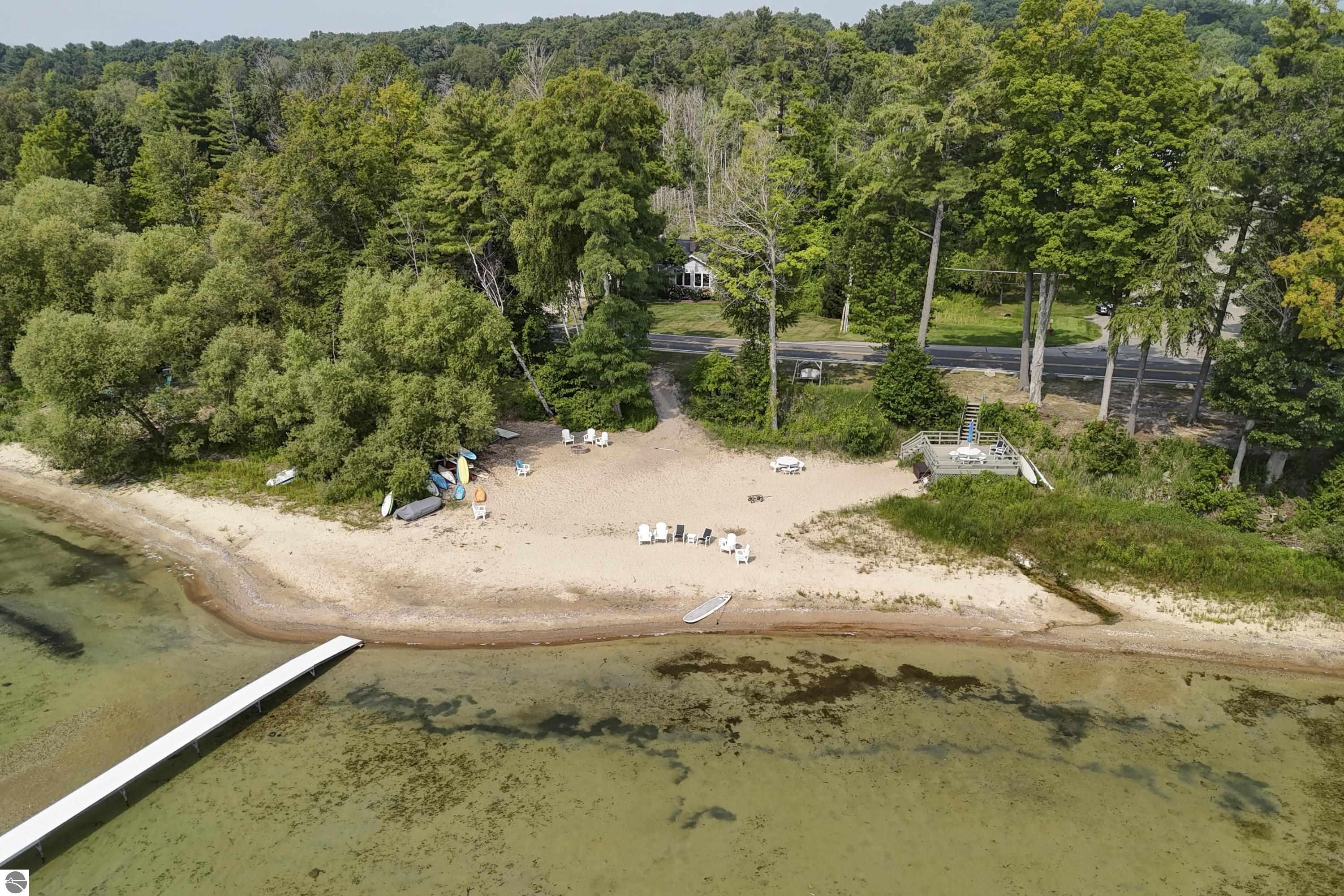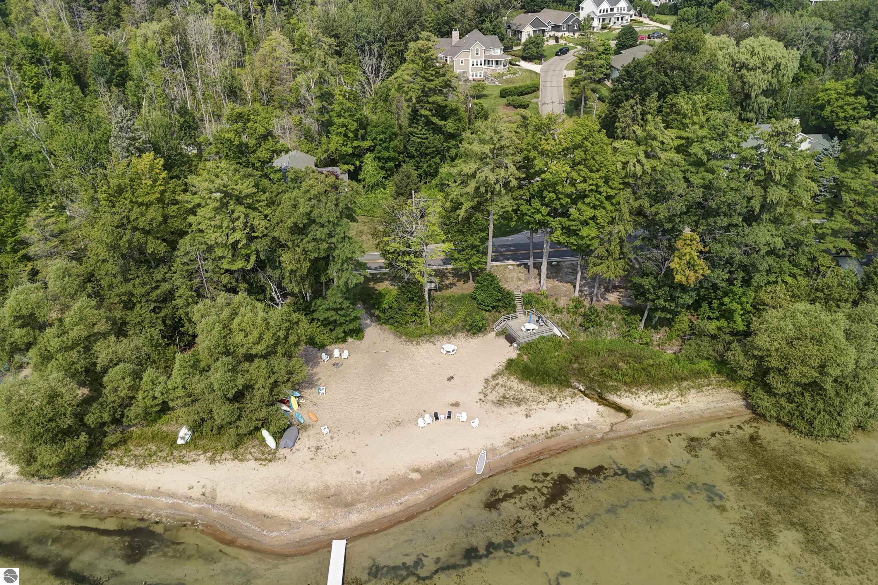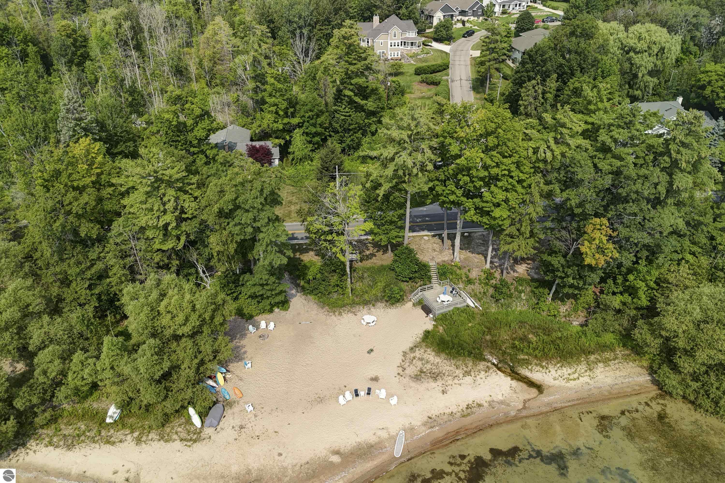 Welcome to Hidden Ridge at the base of Old Mission Peninsula-just 1.6 miles to Eastern Elementary and Central High School- where this custom designed walkout blends timeless architecture with modern comfort. Enjoy sparkling East Bay views and 230' of shared frontage on East Grand Traverse Bay. A welcoming front porch, a three season sunroom, a walkout lower level that opens to a park like beautifully landscaped yard... Inside, rich hardwood floors lead you through a warm, inviting great room anchored by a cozy gas fireplace. Thoughtful custom details are everywhere. Take a video drone tour inside and out. You deserve to call this house your home!
