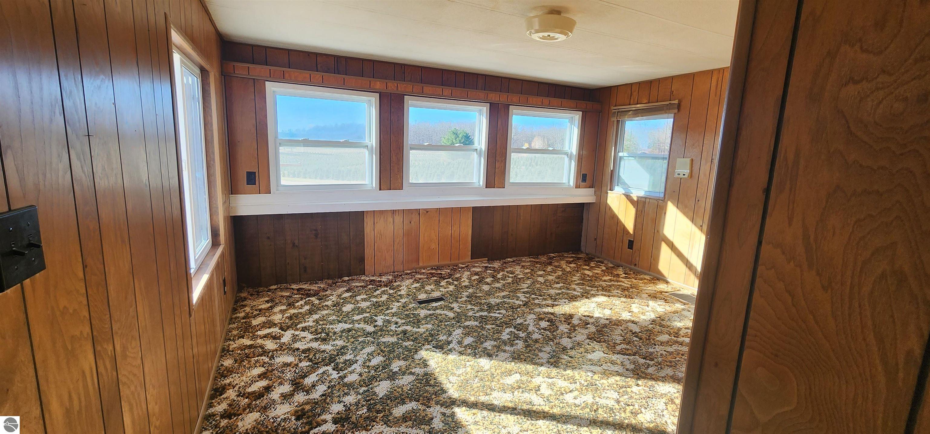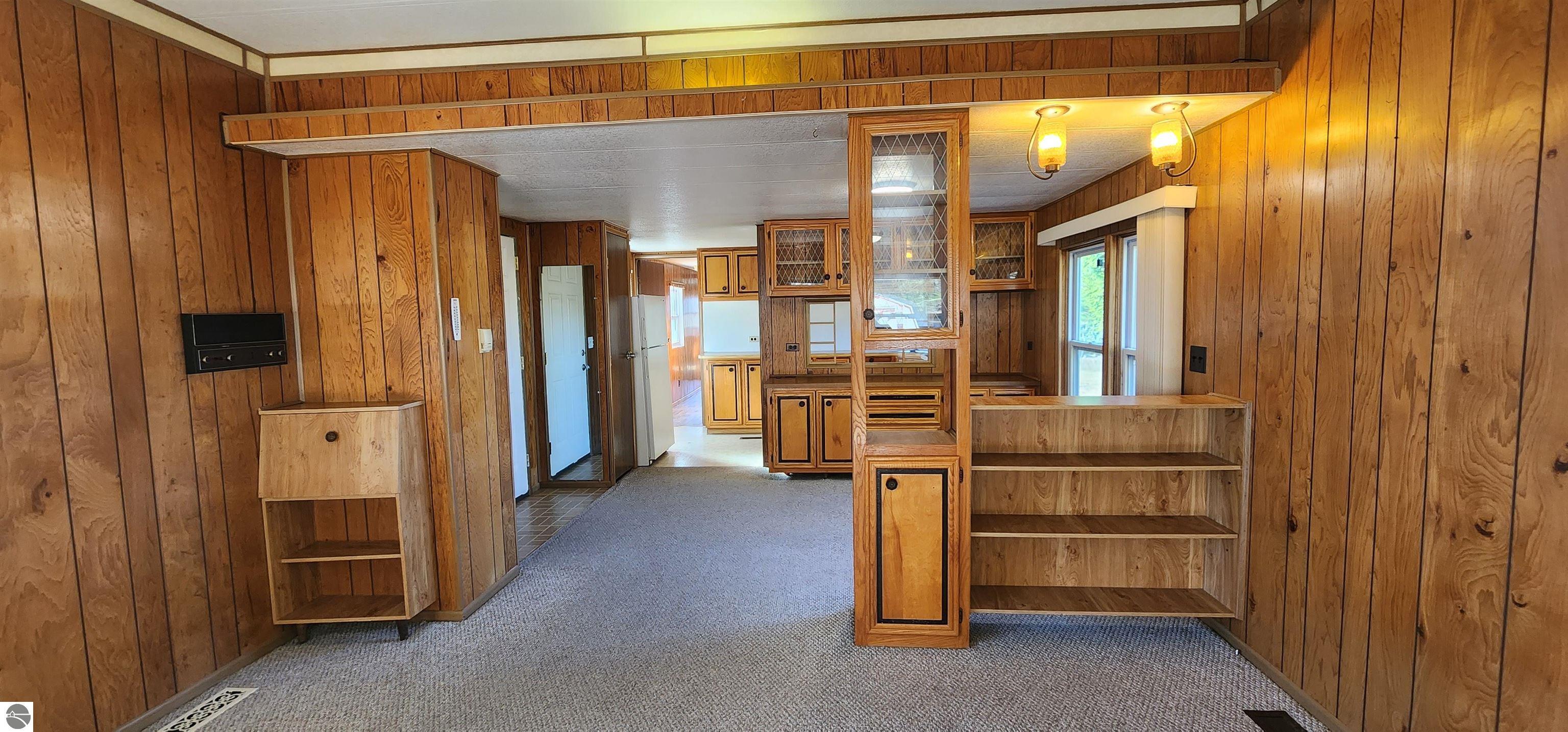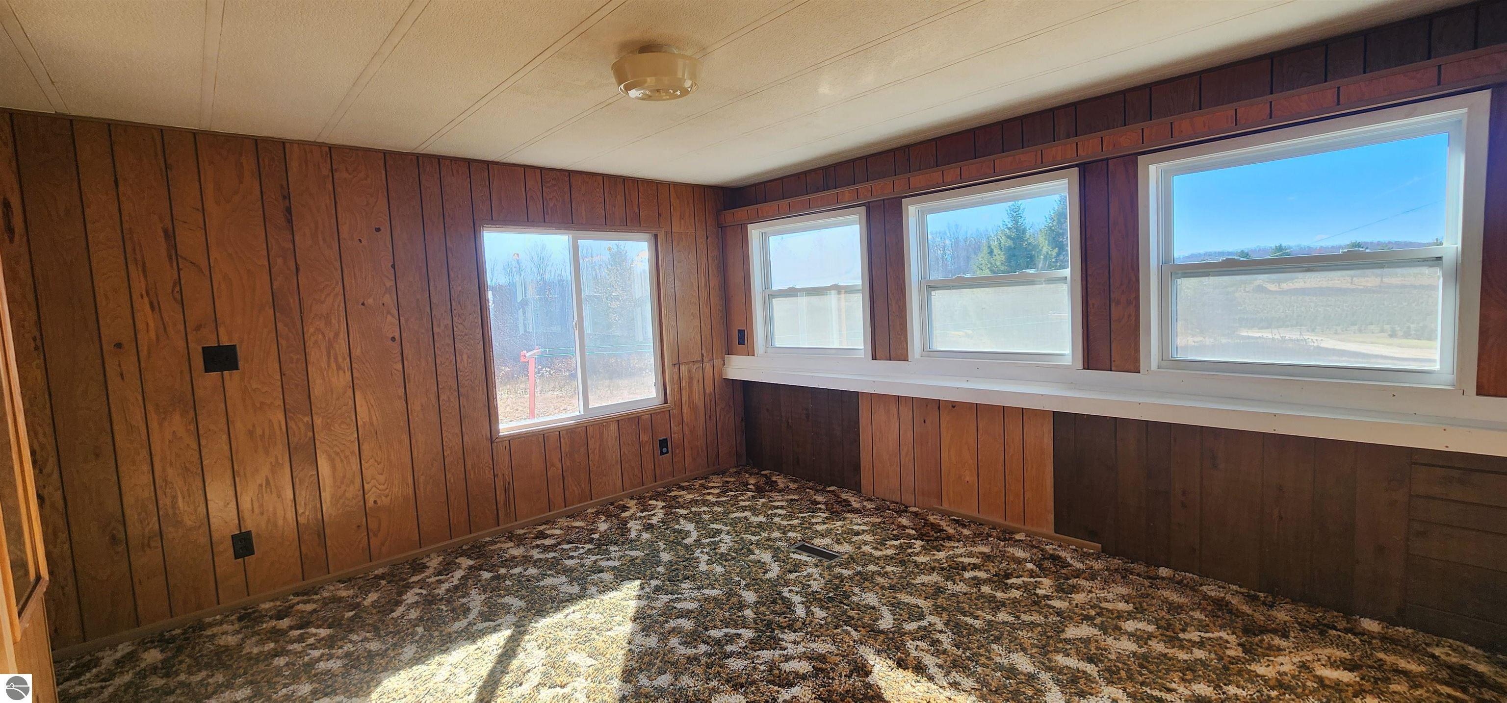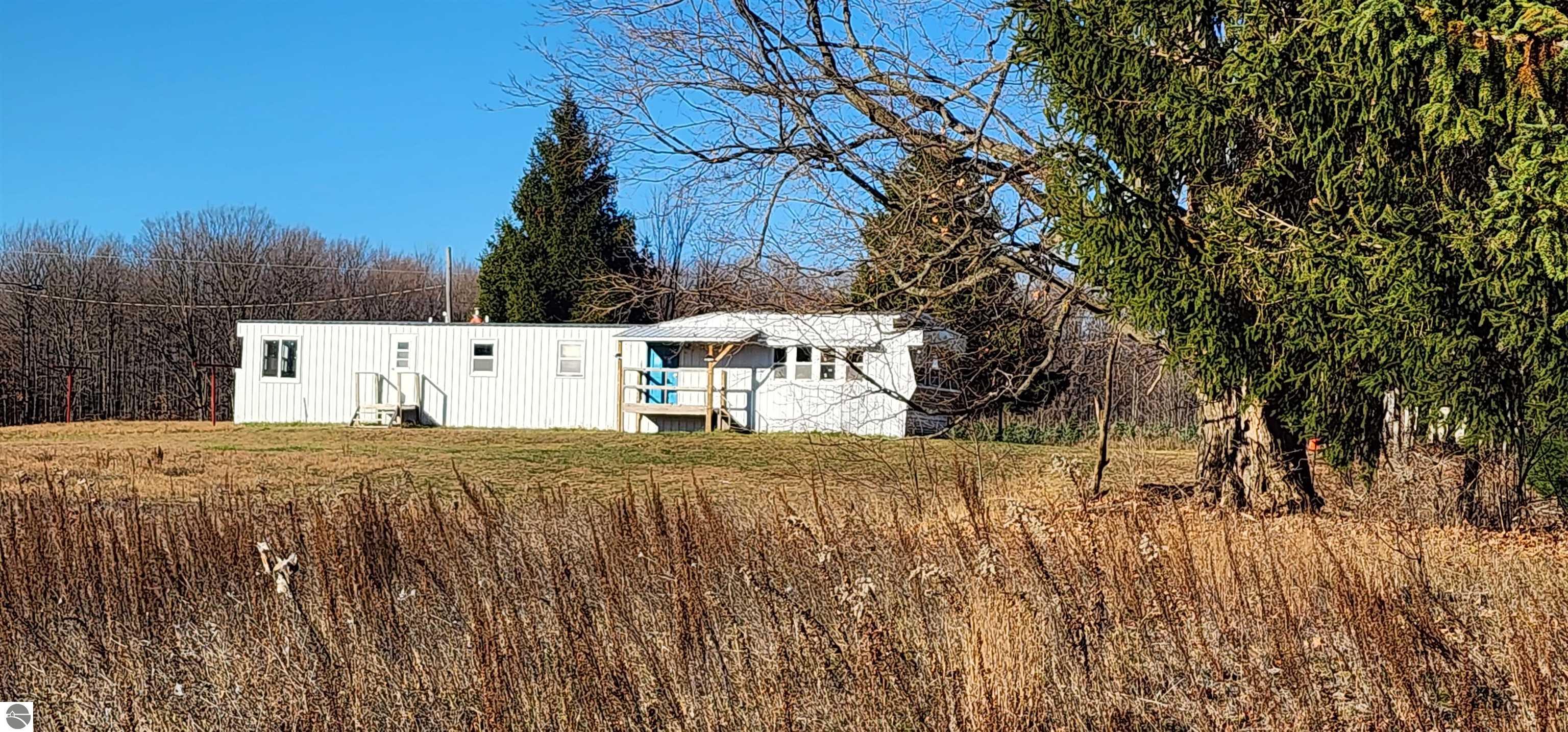 Extremely well-preserved 1978 manufactured home, thoughtfully updated and move-in ready. The sellers have taken great care with improvements, including a new roof, new vinyl windows throughout, and full steel exterior enclosure, providing excellent insulation and long-term durability. This home is believed to have been used as an office at one time, which explains the spacious layout and unique built-ins, and superb condition. Inside, the 17' x 15' living room features bay windows, a ceiling fan, built-in desk, shelving, cabinets, and a functioning radio/intercom system that plays throughout the home and outdoors. The 10' x 12' dining room includes a built-in hutch for added storage. A 13' x 7' galley kitchen offers ample cabinetry, generous counter space, and includes the refrigerator and oven. The second bedroom (10' x 10') has vinyl plank flooring and currently houses the washer and dryer. If preferred, the laundry can easily be relocated back to the bathroom—original hookups remain in place—allowing the room to be used fully as a bedroom again. The 10' x 7' bathroom includes a tub/shower combination and built-in hamper. The 13' x 13' primary bedroom offers a large closet, abundant natural light, and access to the intercom system. Outside, you’ll find a garden shed for extra storage. Well and septic were both new in 2019. Located just off a quiet seasonal road with Spectrum cable and internet available, this peaceful setting is ideal for wildlife viewing and offers excellent potential for a small hobby farm. A tranquil, open property with room to enjoy northern Michigan living.