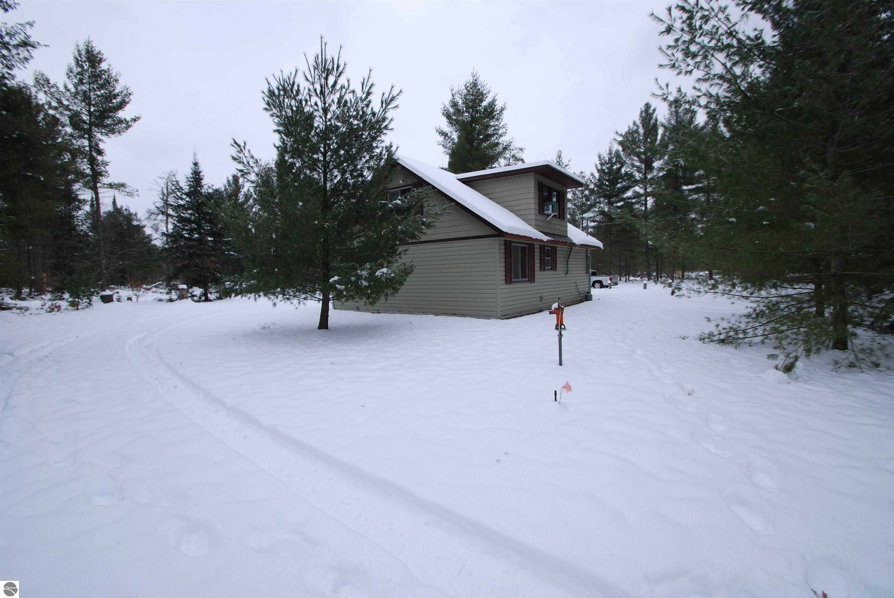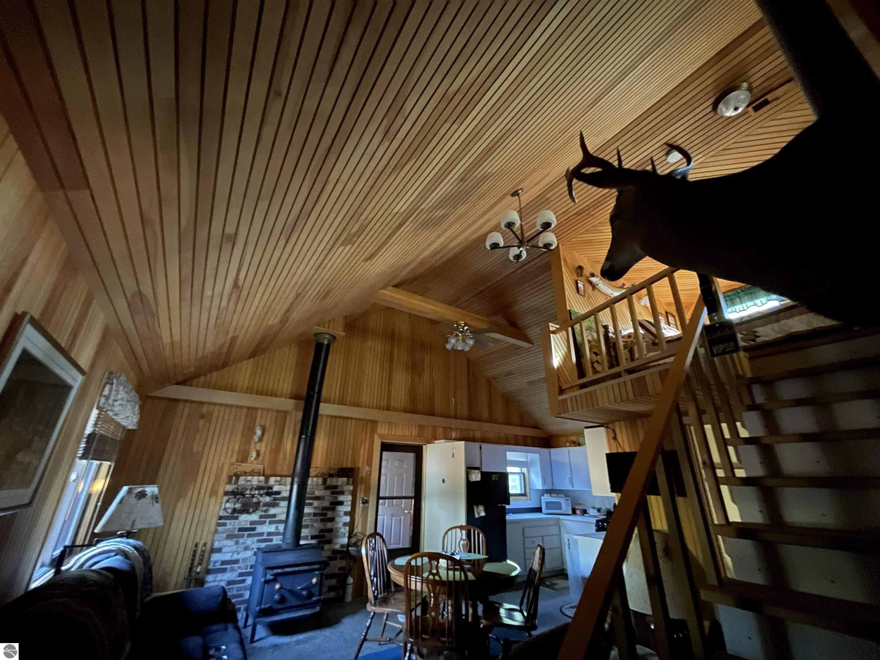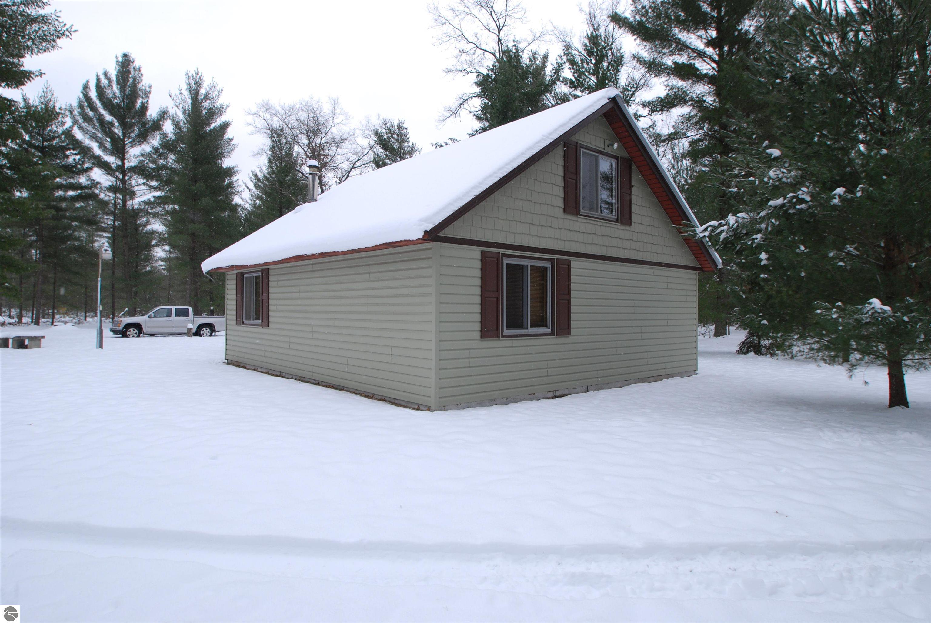 This "one of a kind" hunt camp is waiting for you to take that "Buck" and make memories!!! 20 acres m/l fronting M-33. The well maintained cabin is all set for large gatherings! Covered composite deck leads into a foyer entrance. First thing you will notice is the birch bead board and planking covering the vaulted ceiling and most of the walls. Open living area with spacious kitchen. Living room has a free standing wood stove. Two bedrooms and a 3/4 bath make up the remaining main level. Staircase leads to the loft area with dormer ~extra sleeping space and two spacious bedrooms. Exterior has newer vinyl siding and steel roofing. Enjoy cooking outdoors over the fire pit. Close to the cabin is a garden shed for storage and a small pavilion plus circle drive. Borders 1,000 acres of state land on the north property line. Great location not far from I-75 and approximately 7 miles to West Branch.