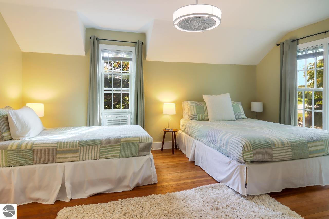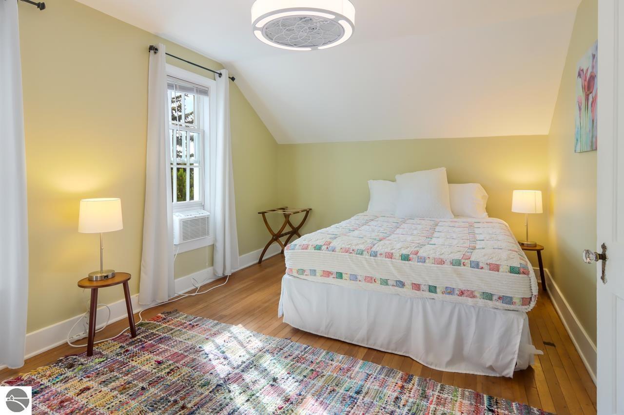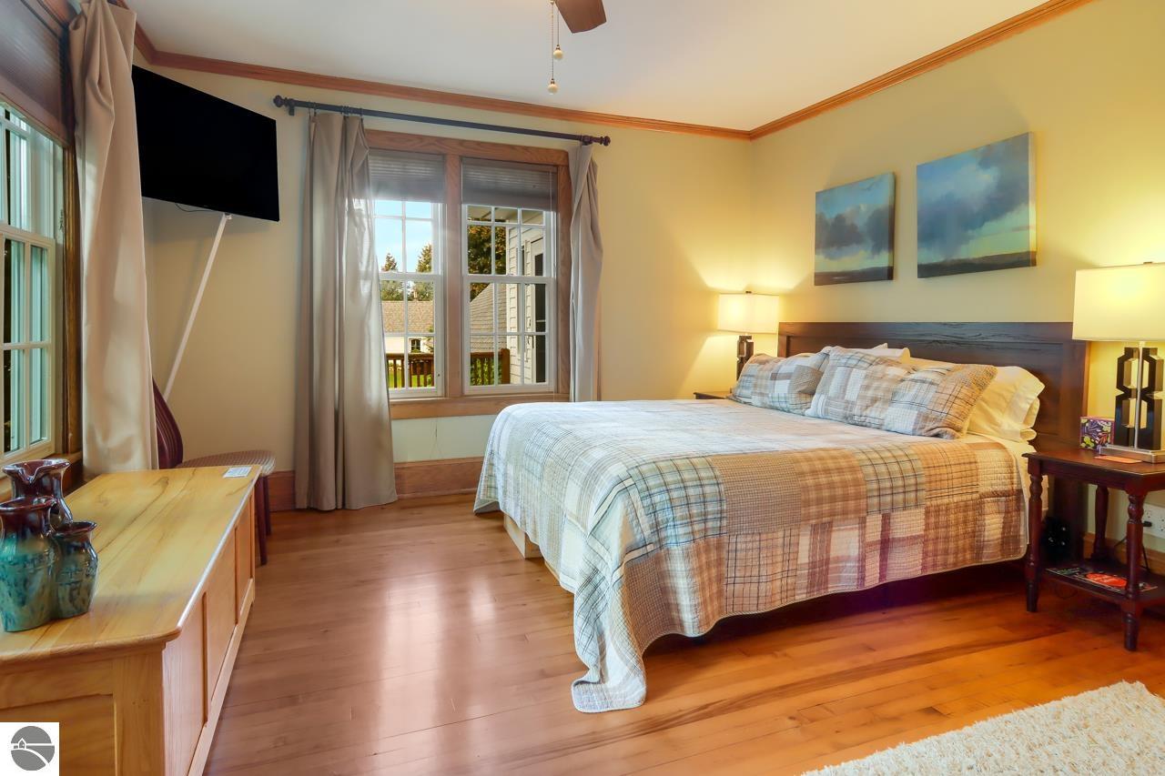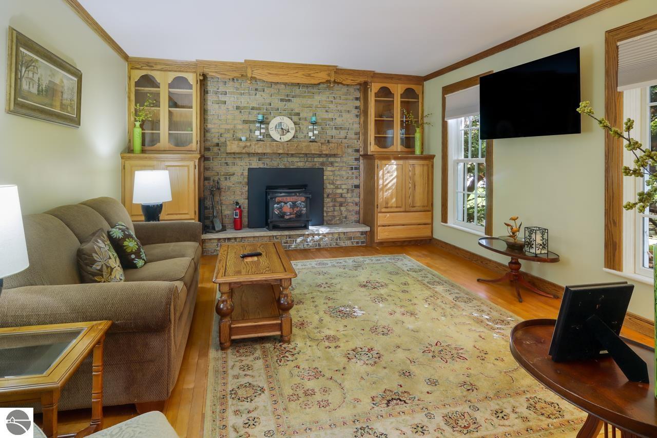 A SERENE SETTING on 1.34 acres. Timeless family home conveniently located between Elk Rapids and Traverse City in desirable, award winning Elk Rapids school district. As you begin your tour discover a comfortable and generously sized living room enhanced by hardwood floors, crown molding and a bay window. Large country kitchen with plenty of cabinetry, stainless appliances; island and hardwood floors. Spacious dining room with large picturesque window. A large, main floor family room with hardwood floors, crown molding, custom built-ins and a fireplace with brick surround. Main floor primary suite with wood floors, ceiling fan and plenty of windows for natural light. Additional amenities include 4 bedrooms, 2 baths; built in bookcase; architectural details; nice woodwork; mud room; nice size laundry/office room; over 2,406 sq. ft. of living space; underground sprinklers. Your friends and family will appreciate having their own space in the guest house. Relax on the covered porch and enjoy your peaceful setting and professionally landscaped grounds.