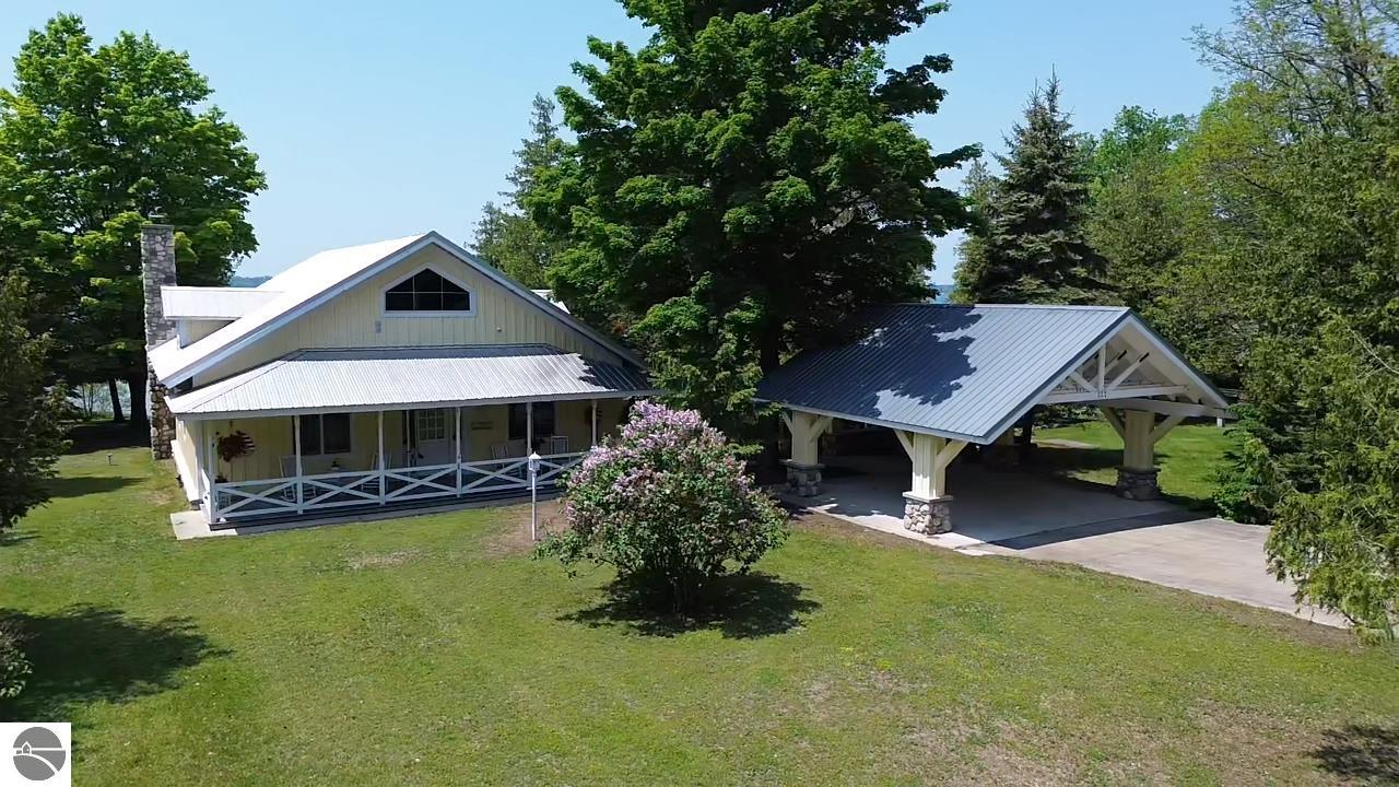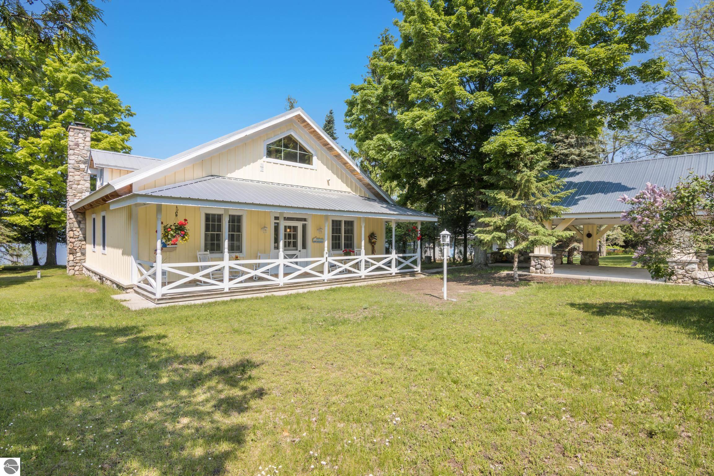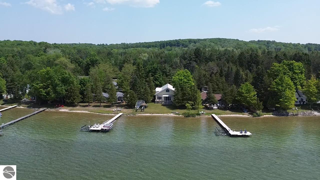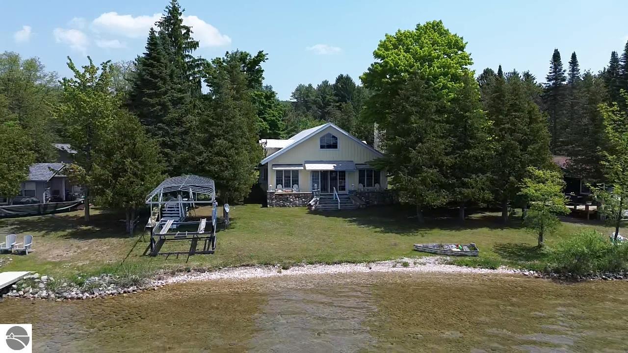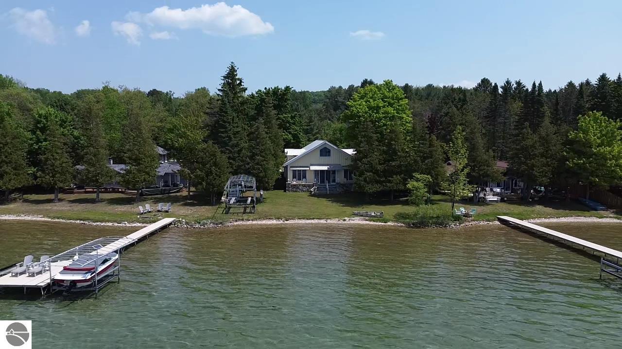 TORCH LAKE IS WAITING for you to come enjoy the waterfront lifestyle. Get ready to enjoy world class watersports on the entire Chain-of-Lakes, swimming, sailing, power boating or just sitting back to watch the sunset over your 89’ of private frontage. This “Up North” cottage style home has been thoughtfully designed, decorated, and beautifully maintained to be your four season get-a-way retreat or year around home. A covered front porch will be the place to relax and greet your guests as they arrive to your piece of paradise on the shores of Torch Lake. Step into the foyer and imagine yourself creating memories with your family in this home. The light filled living room is enhanced by a stone fireplace; massive beams of Florida Pine grace the ceilings, gorgeous Maple hardwood floors and views of the lake. The kitchen/dining area will be the place to create your culinary delights featuring an island with bar seating; unique lighting; stainless appliances; two dishwashers; farmhouse sink; butcher block countertops; built-ins; and walk-in pantry. French doors lead you to the covered back porch where you can dine alfresco or listen to the loons sing. The primary bedroom with dual cedar lined closets and bath with unique fieldstone shower. Both bedrooms are ensuite, feature hardwood floors and are generously sized. Large laundry room with plenty of storage space and cabinetry. Additional details include a low maintenance steel roof; stone accents on the exterior; large car port with architectural; detailing; beautiful mature trees; and central air. Golf, ski resorts, recreational trails, shopping, dining, quaint waterfront communities are just a short drive away.