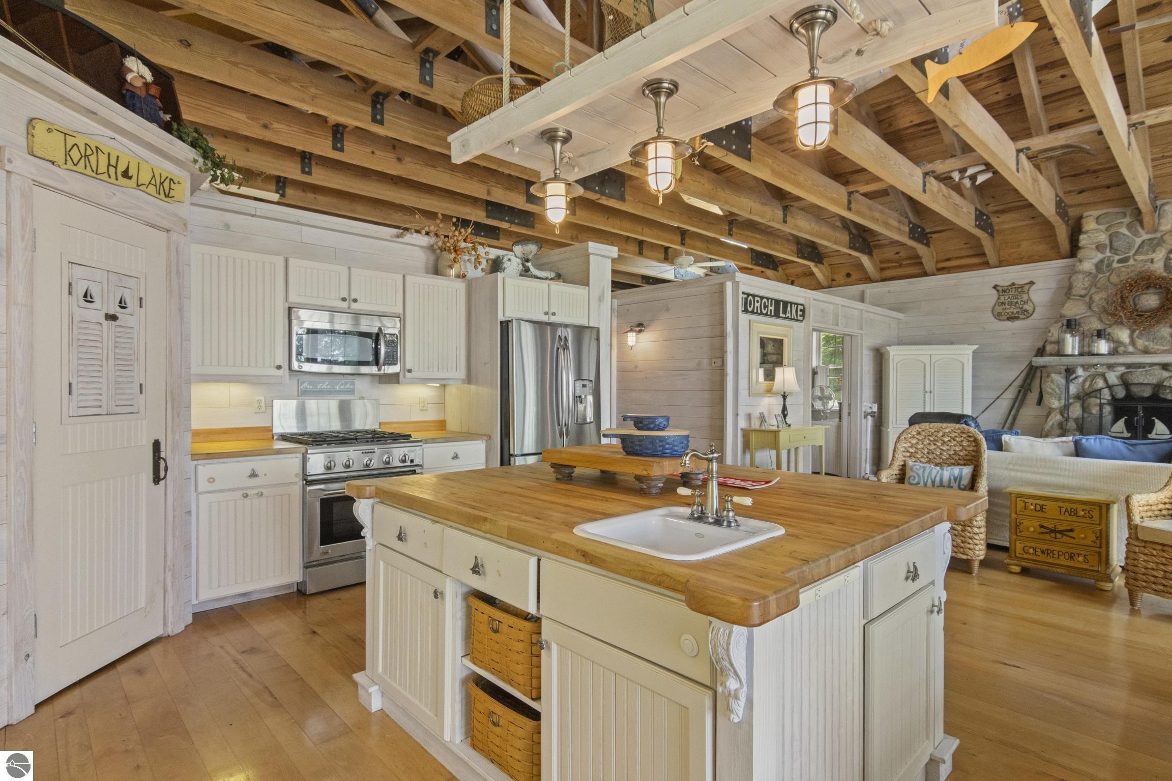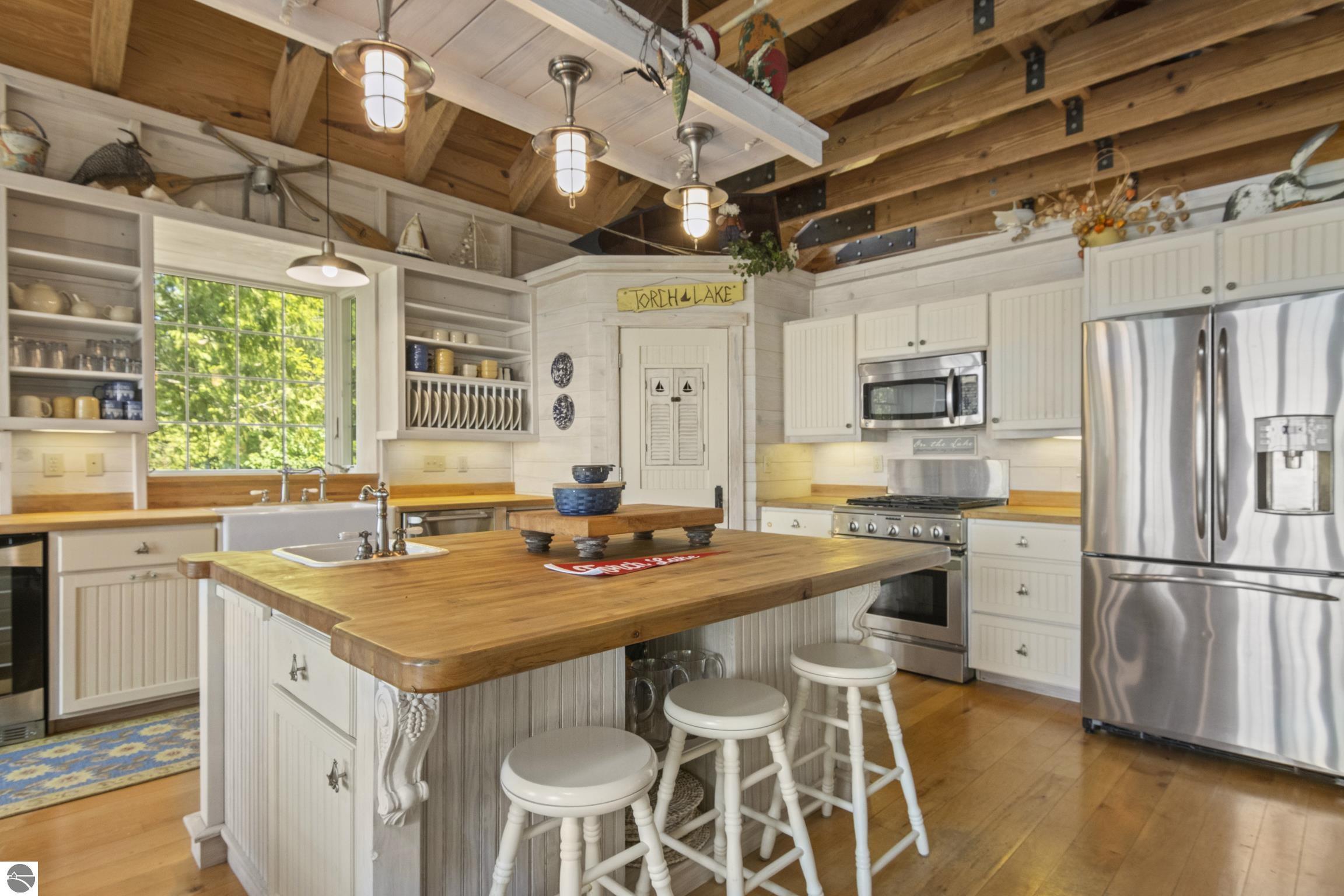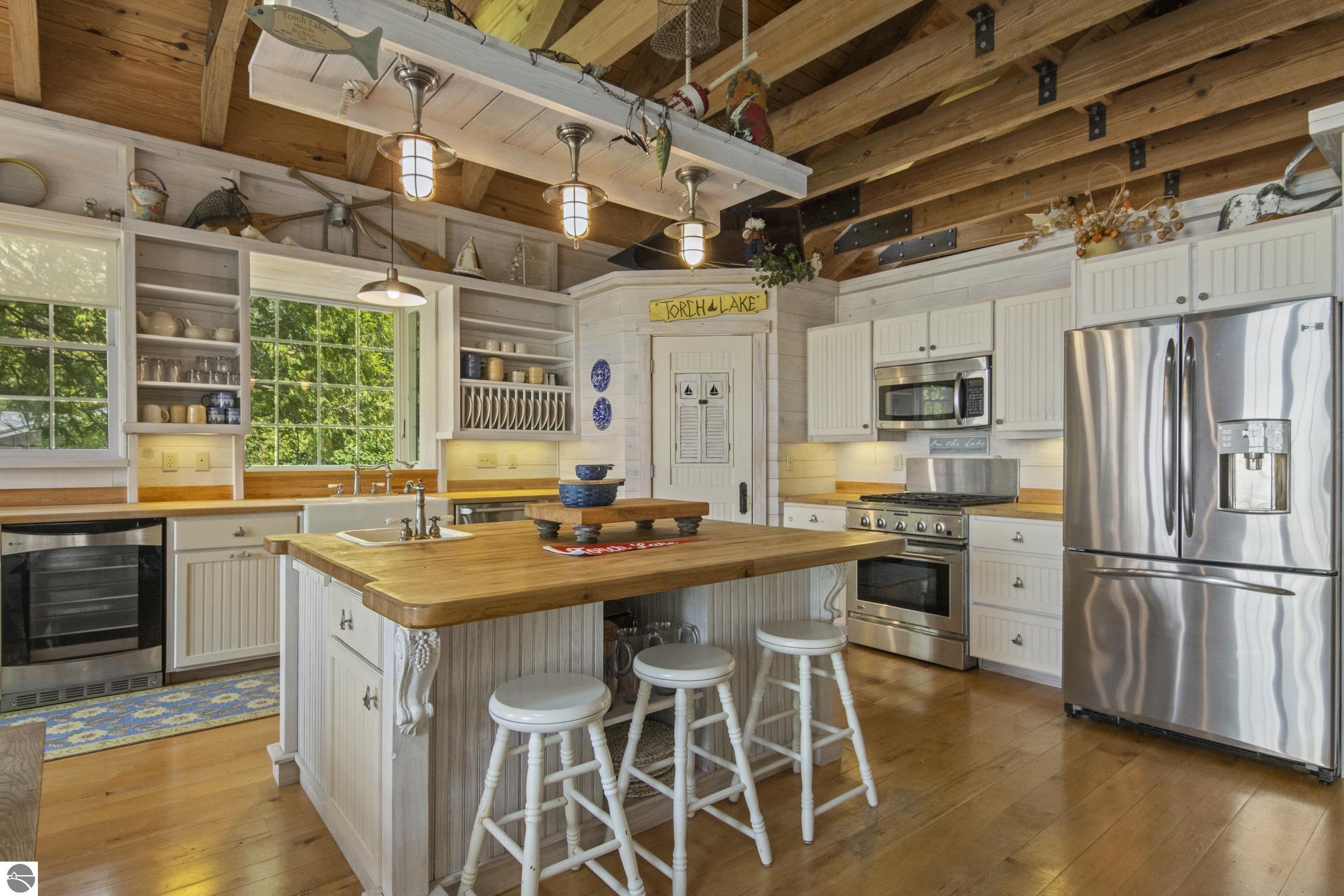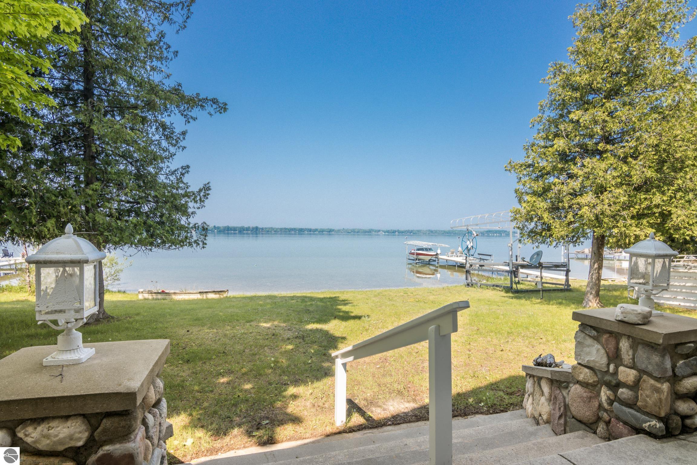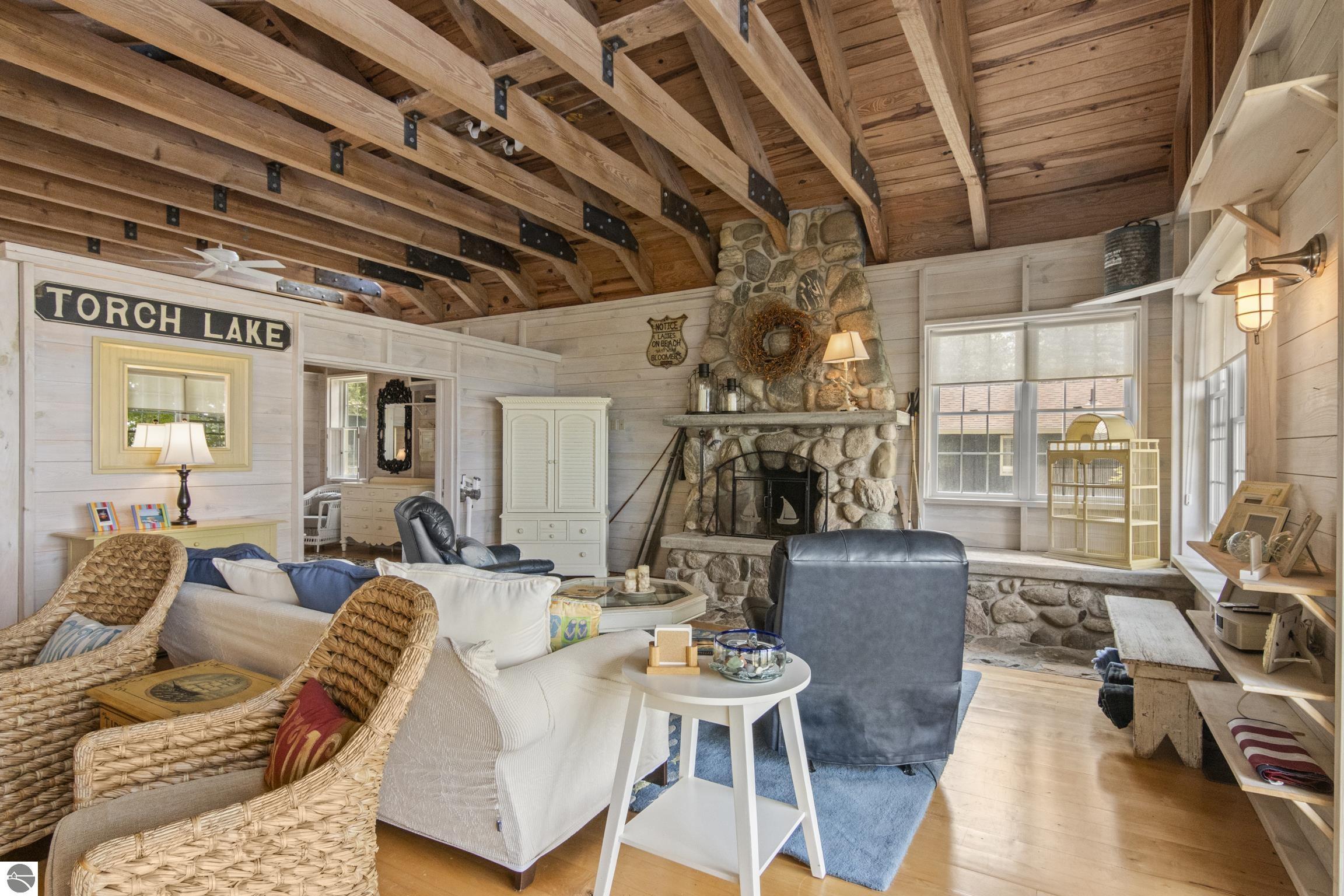 TORCH LAKE IS WAITING for you to come enjoy the waterfront lifestyle. Get ready to enjoy world class watersports on the entire Chain-of-Lakes, swimming, sailing, power boating or just sitting back to watch the sunset over your 89’ of private frontage. This “Up North” cottage style home has been thoughtfully designed, decorated, and beautifully maintained to be your four season get-a-way retreat or year around home. A covered front porch will be the place to relax and greet your guests as they arrive to your piece of paradise on the shores of Torch Lake. Step into the foyer and imagine yourself creating memories with your family in this home. The light filled living room is enhanced by a stone fireplace; massive beams of Florida Pine grace the ceilings, gorgeous Maple hardwood floors and views of the lake. The kitchen/dining area will be the place to create your culinary delights featuring an island with bar seating; unique lighting; stainless appliances; two dishwashers; farmhouse sink; butcher block countertops; built-ins; and walk-in pantry. French doors lead you to the covered back porch where you can dine alfresco or listen to the loons sing. The primary bedroom with dual cedar lined closets and bath with unique fieldstone shower. Both bedrooms are ensuite, feature hardwood floors and are generously sized. Large laundry room with plenty of storage space and cabinetry. Additional details include a low maintenance steel roof; stone accents on the exterior; large car port with architectural; detailing; beautiful mature trees; and central air. Golf, ski resorts, recreational trails, shopping, dining, quaint waterfront communities are just a short drive away.