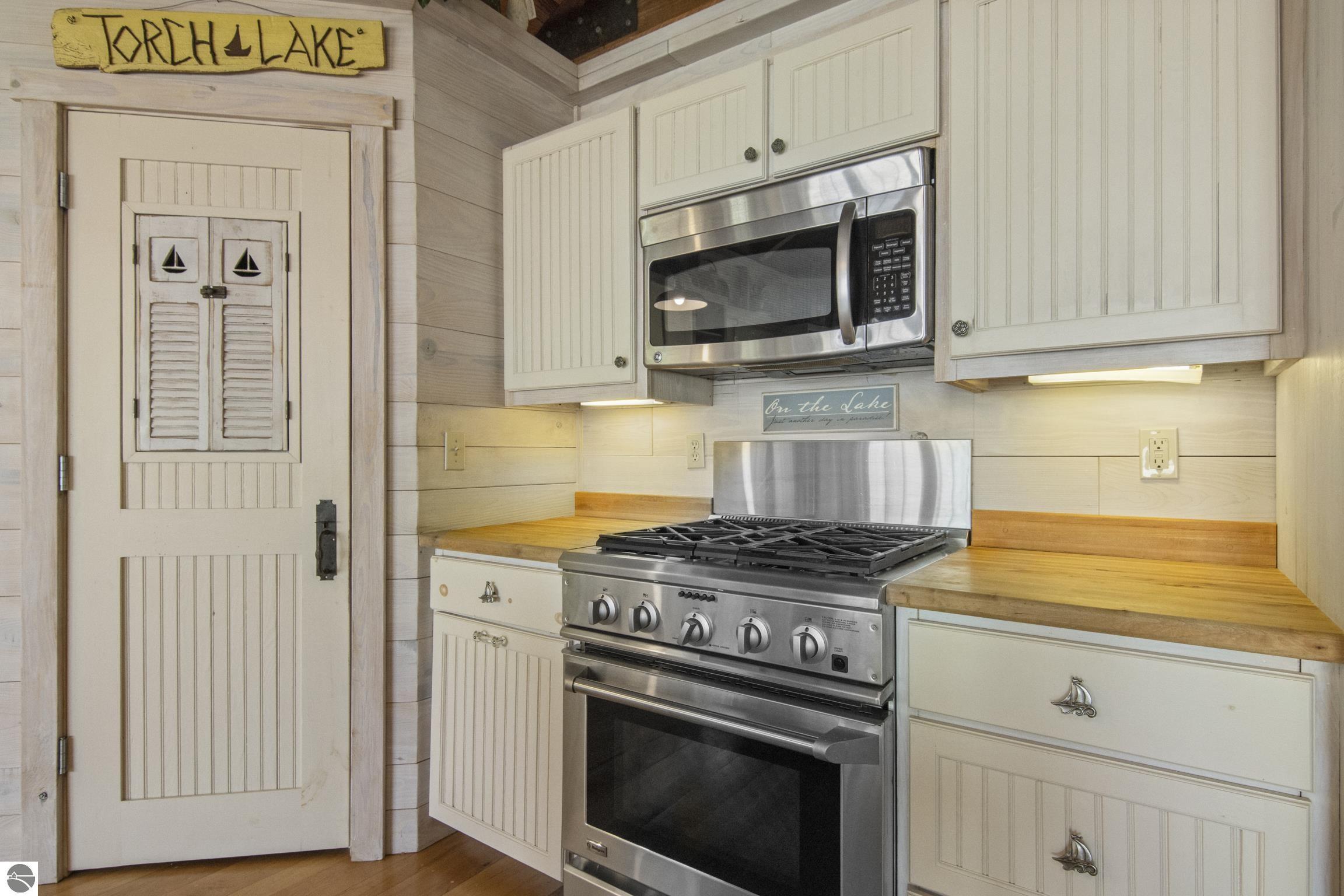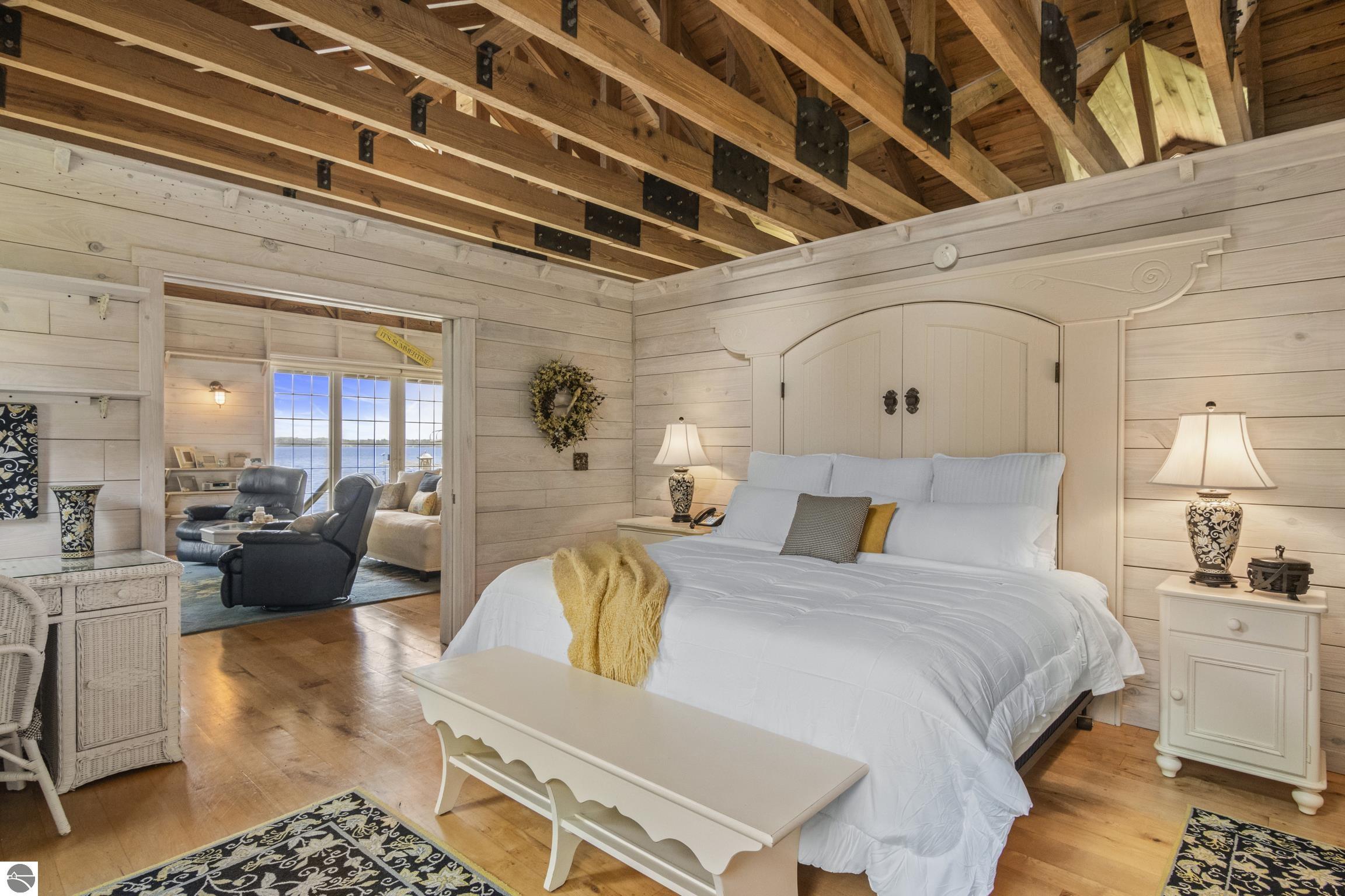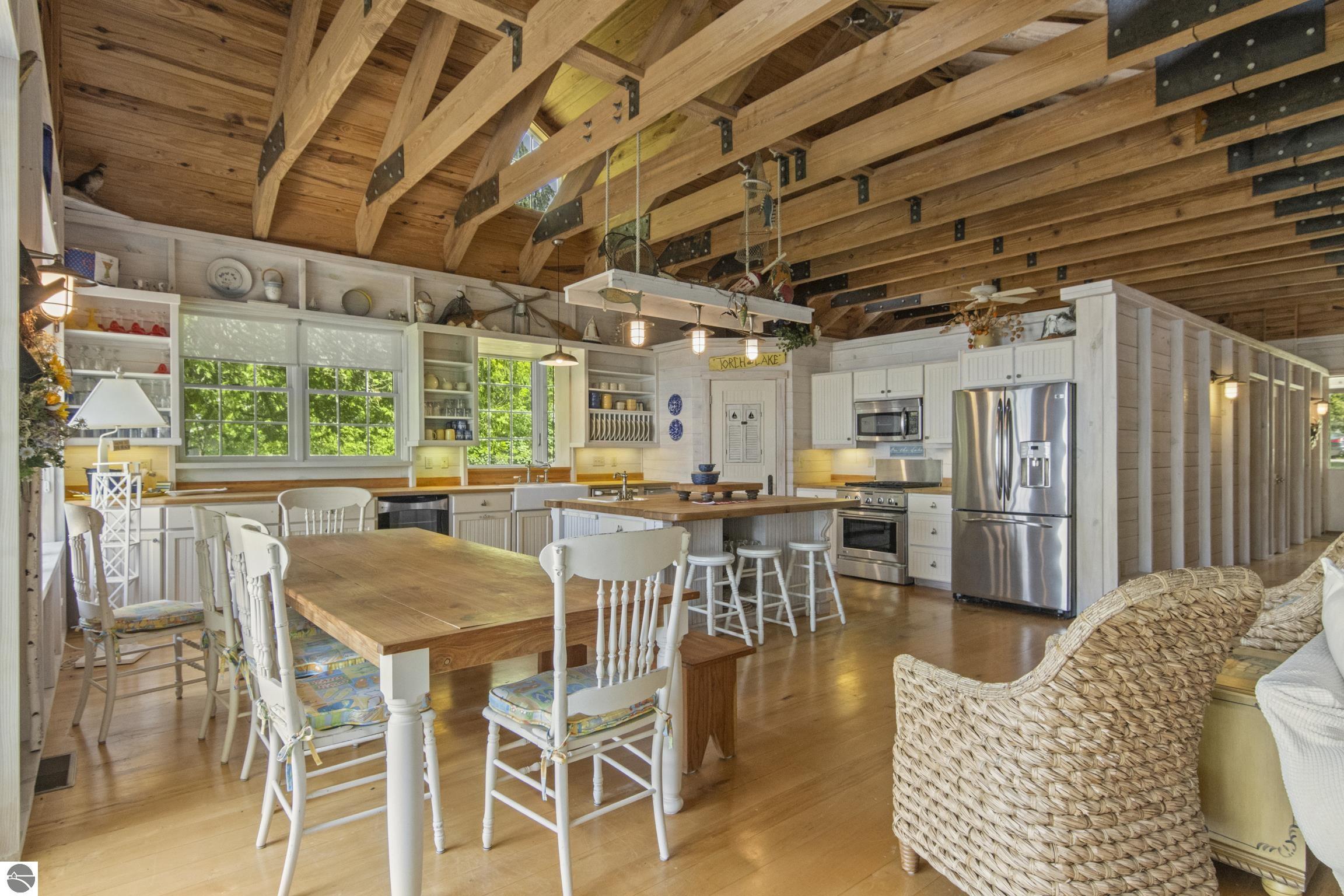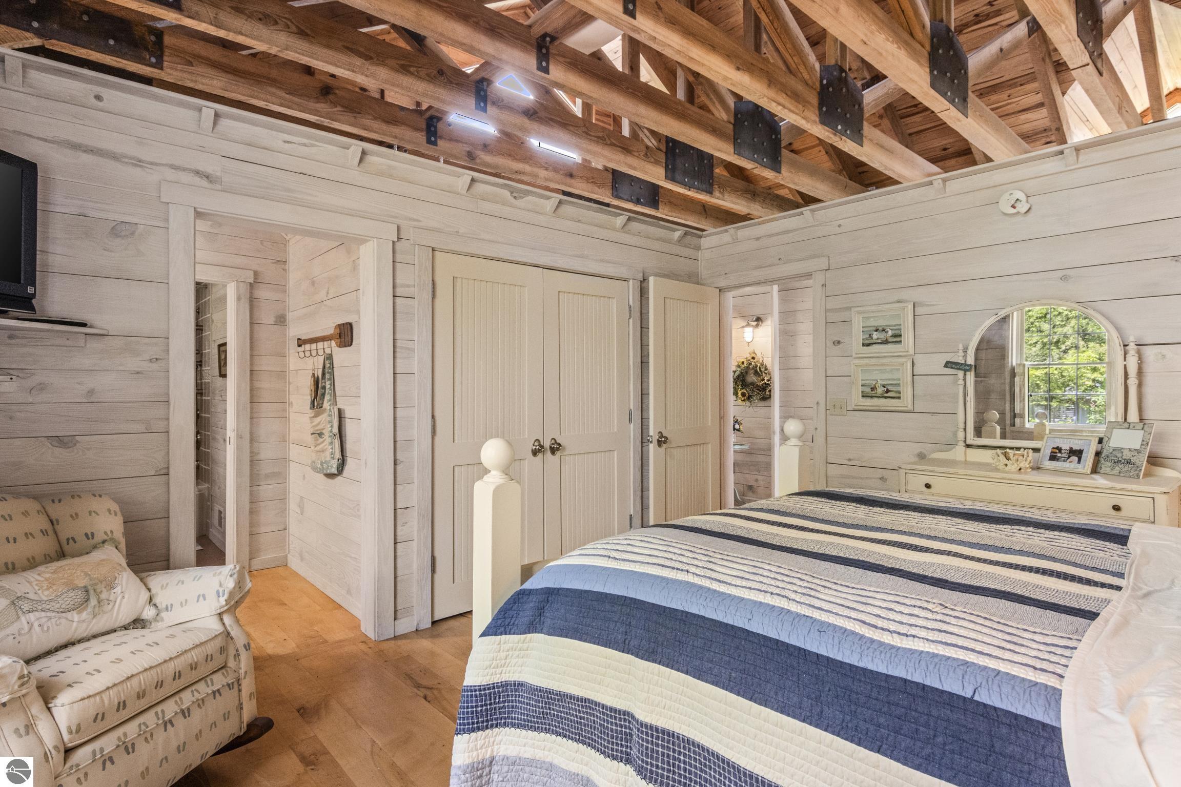 TORCH LAKE IS WAITING for you to come enjoy the waterfront lifestyle. Get ready to enjoy world class watersports on the entire Chain-of-Lakes, swimming, sailing, power boating or just sitting back to watch the sunset over your 89’ of private frontage. This “Up North” cottage style home has been thoughtfully designed, decorated, and beautifully maintained to be your four season get-a-way retreat or year around home. A covered front porch will be the place to relax and greet your guests as they arrive to your piece of paradise on the shores of Torch Lake. Step into the foyer and imagine yourself creating memories with your family in this home. The light filled living room is enhanced by a stone fireplace; massive beams of Florida Pine grace the ceilings, gorgeous Maple hardwood floors and views of the lake. The kitchen/dining area will be the place to create your culinary delights featuring an island with bar seating; unique lighting; stainless appliances; two dishwashers; farmhouse sink; butcher block countertops; built-ins; and walk-in pantry. French doors lead you to the covered back porch where you can dine alfresco or listen to the loons sing. The primary bedroom with dual cedar lined closets and bath with unique fieldstone shower. Both bedrooms are ensuite, feature hardwood floors and are generously sized. Large laundry room with plenty of storage space and cabinetry. Additional details include a low maintenance steel roof; stone accents on the exterior; large car port with architectural; detailing; beautiful mature trees; and central air. Golf, ski resorts, recreational trails, shopping, dining, quaint waterfront communities are just a short drive away.