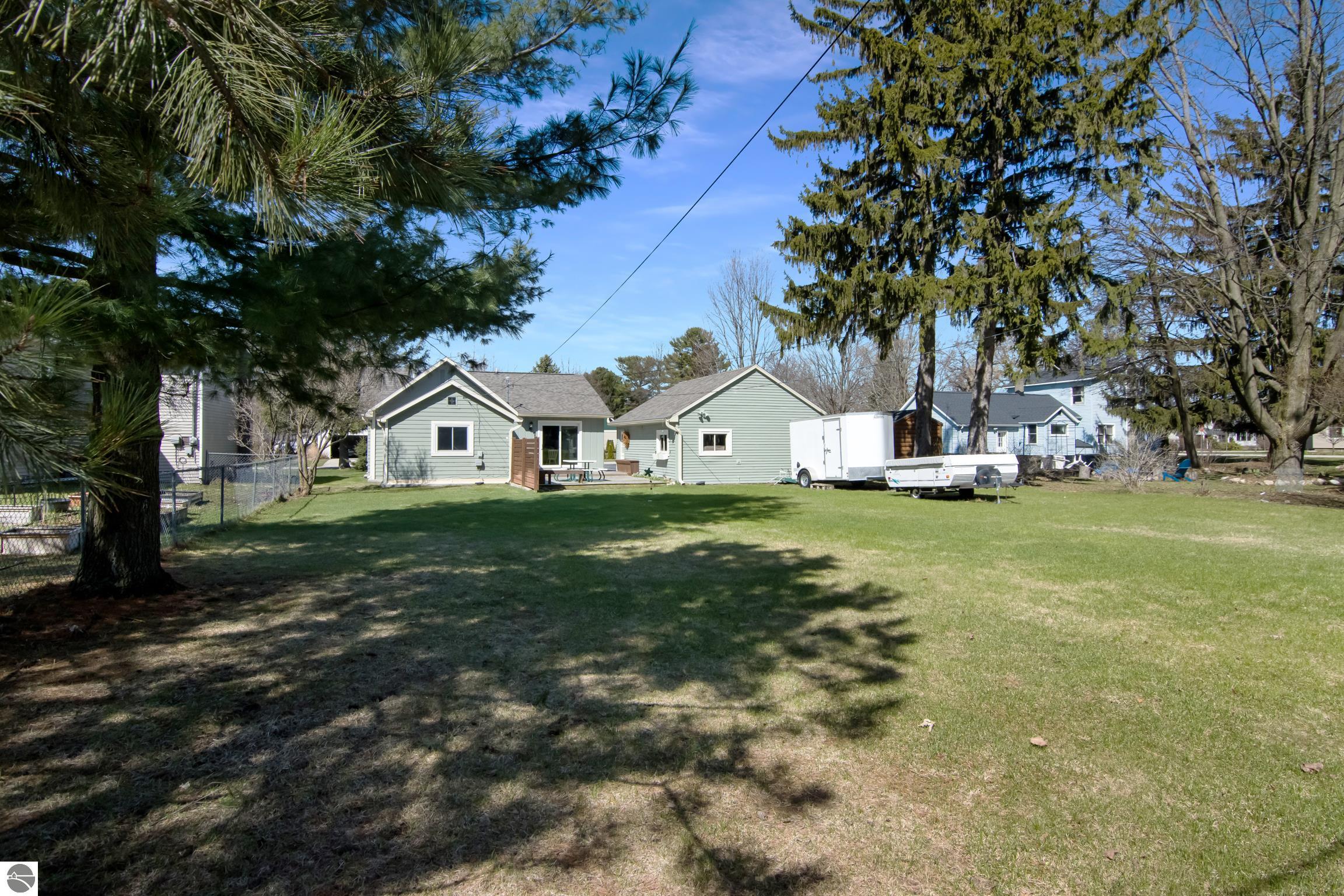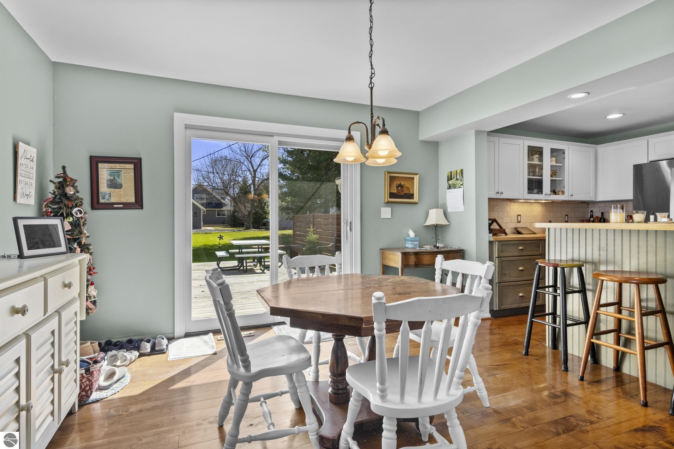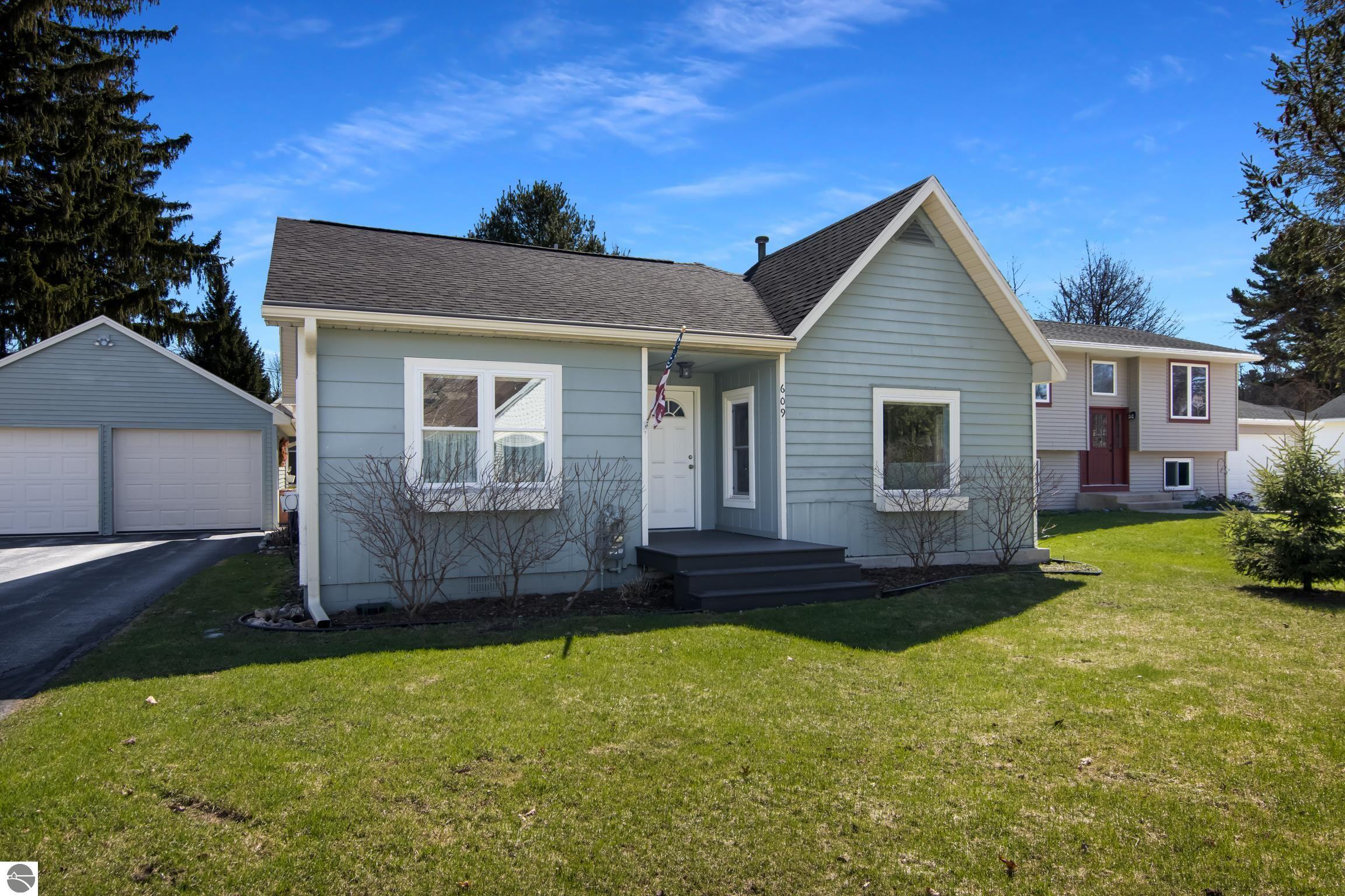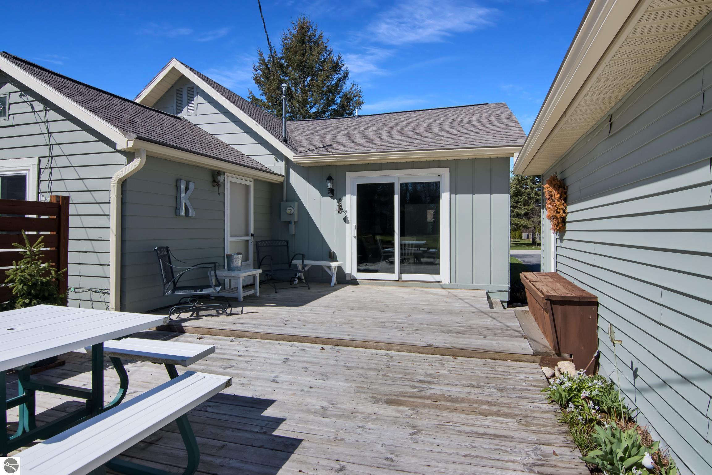 THE DESIRABLE WEST SIDE of Elk Rapids is waiting to welcome you home to this newly listed bungalow. As you begin your tour you will discover generously sized windows in the living spaces offer plenty of natural light. The chef in your family will appreciate the kitchen with lots of updated features; stainless appliances, bar seating; beautiful cabinetry; and more. The dining area with a slider which leads you to the deck for al fresco meals and outdoor entertaining. Spacious primary suite with cathedral ceilings, natural wood ceiling and walls, dual closets, the sitting area will be the perfect reading nook or home office. Additional amenities include a laundry room, central air conditioning, 2-car detached garage, landscaped setting, and more. The window boxes are waiting for you to fill with your favorite colorful blooms. Get ready to make cherished memories in the quaint Village of Elk Rapids, where you can walk or ride your bike to the beach, parks, marina, downtown shops, theater and restaurants. Small town living at its finest, where your neighbors will greet you with a smile and a hello while you stroll the tree lined streets.